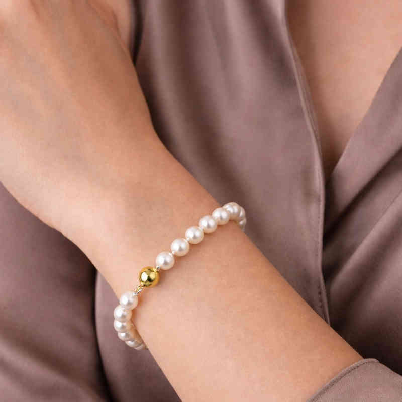Гривната е изработена от висококачествени, бели, сладководни перли с размер 7.50 мм – отлично качество, с естествен бял цвят и нежен, огледален блясък. Всяка перла е внимателно подбрана заради своята форма, гладкост и цвят, което придава на бижуто хармоничен и изискан вид.
