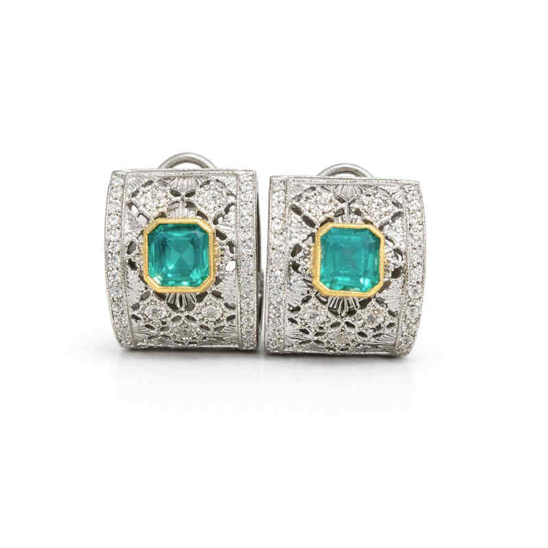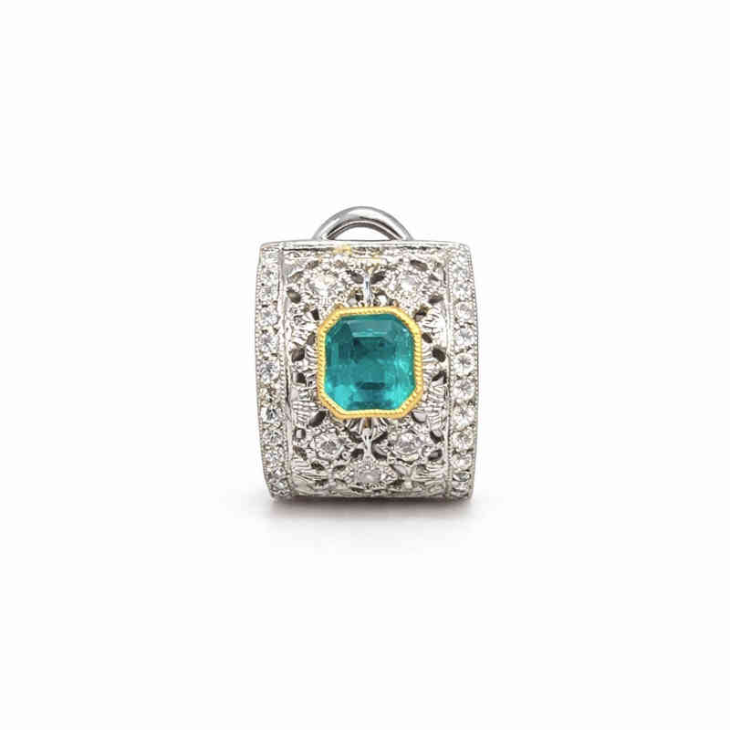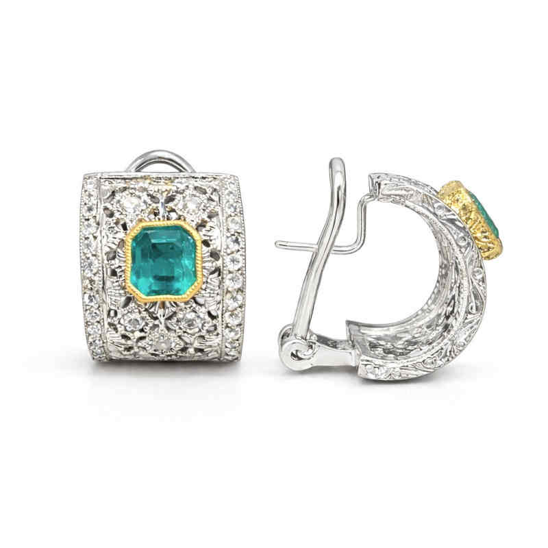 Акцентът на този чифт приказни обеци са прекрасните смарагди в наситено зелено, обрамчени с фина рамка от жълто злато, която подчертава дълбочината на цвета им. Добавихме естествени диаманти, вградени върху бяло 18-каратово злато, за да придадем още повече блясък и елегантност на бижуто.