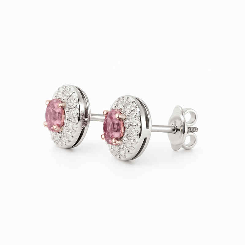 Потопете се в света на изисканата елегантност с тези луксозни обеци, изработени от бяло и розово злато и инкрустирани с естествени диаманти с най-високо качество. В сърцето на всяка обеца блести розов диамант, символ на нежност и изтънчен вкус.