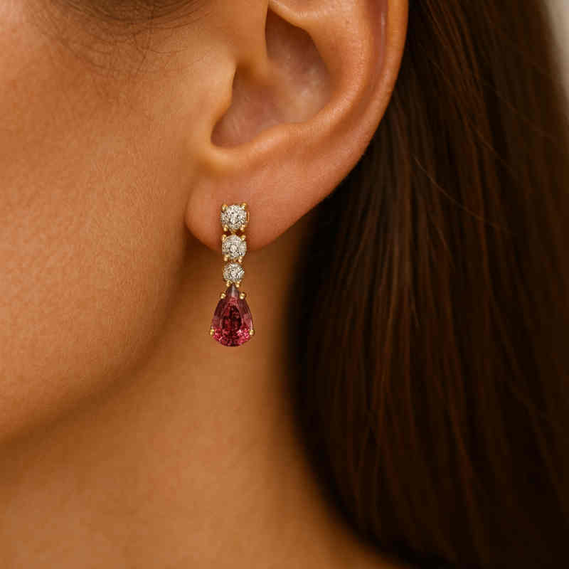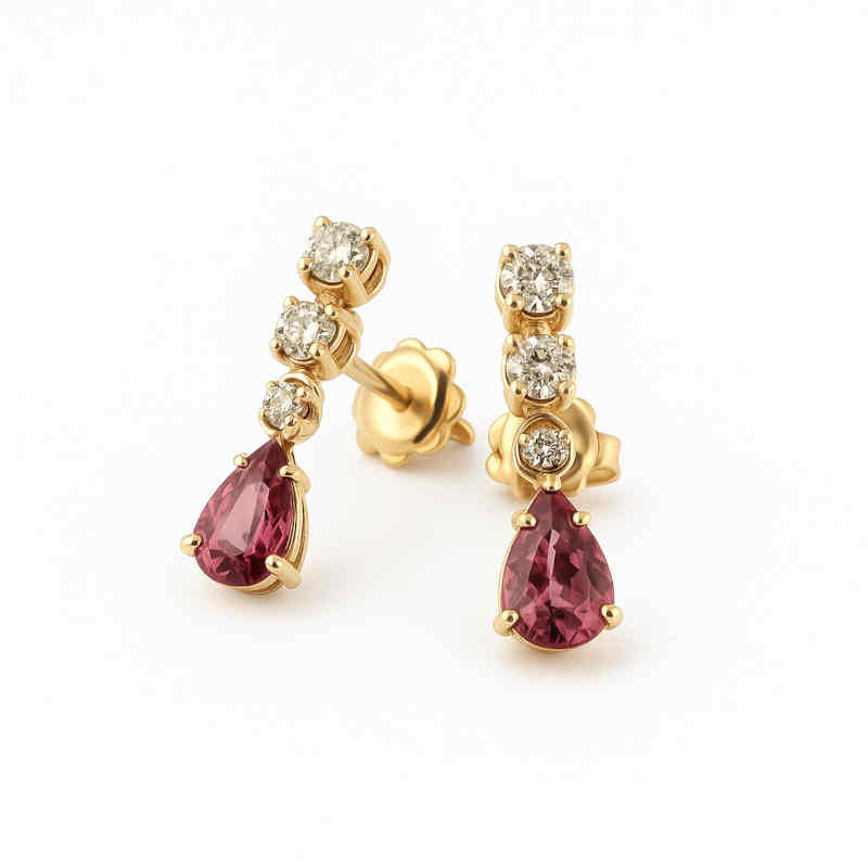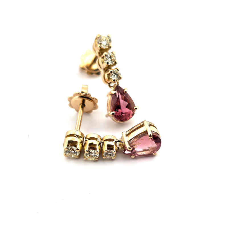 Нежност, цвят и блясък се сливат в едно в тези впечатляващи обеци от жълто злато, вдъхновени от класическата форма на капката. Във всяка от тях плавно се преливат три нетретирани жълти диаманта, разположени грациозно от най-големия към най-малкия, които завършват с естествен рубелит – турмалин с наситен, розов цвят.