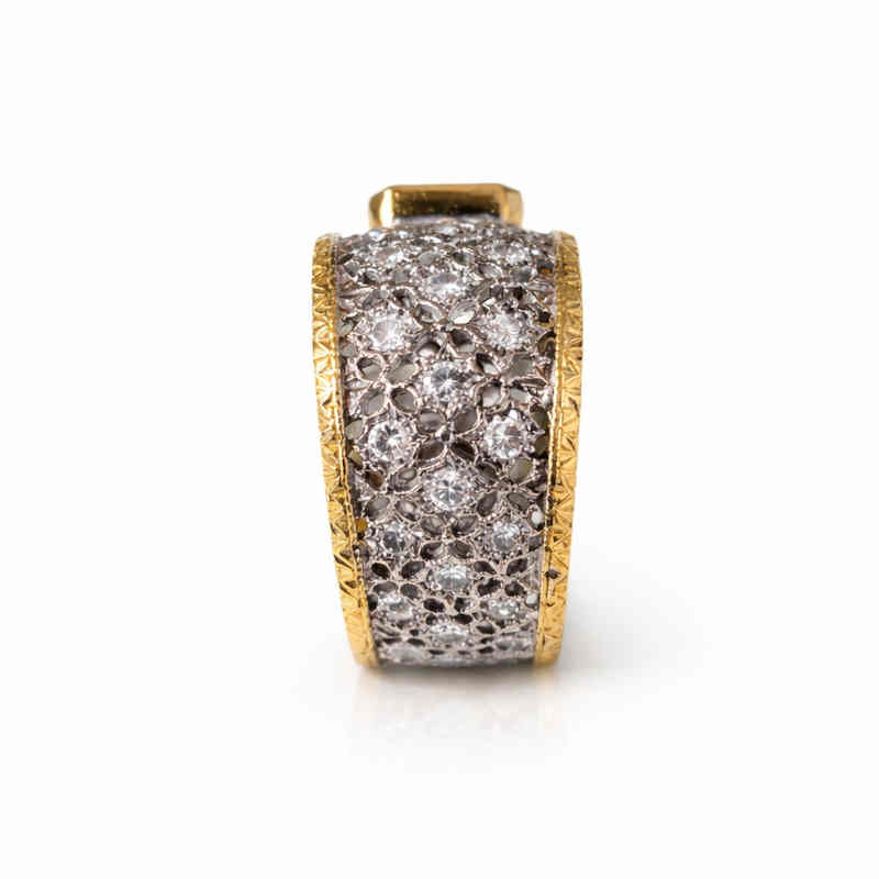 Едно истинско произведение на ювелирното изкуство, съчетаващо традиция, изящество и неподвластен на времето стил. Изработен от 18 карата бяло и жълто злато, впечатлява с фината флорентинска старинна техника „Флорентинска дантела“, изпълнена изцяло ръчно в Италия.