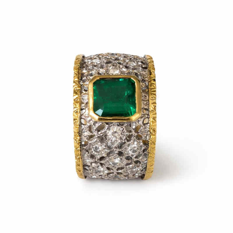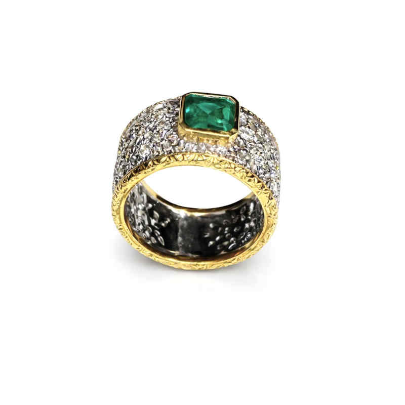 В центъра му вградихме впечатляващ смарагд с невероятна чистота, наситен цвят и дълбочина, обграден от естествени диаманти, които придават изключителен блясък и изтънченост.