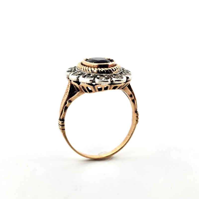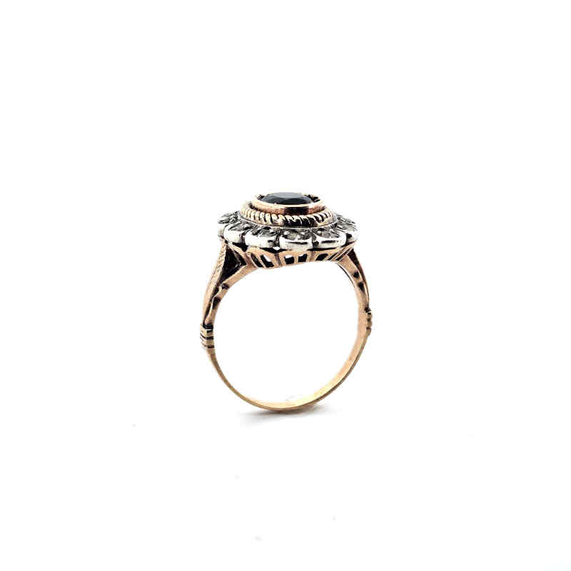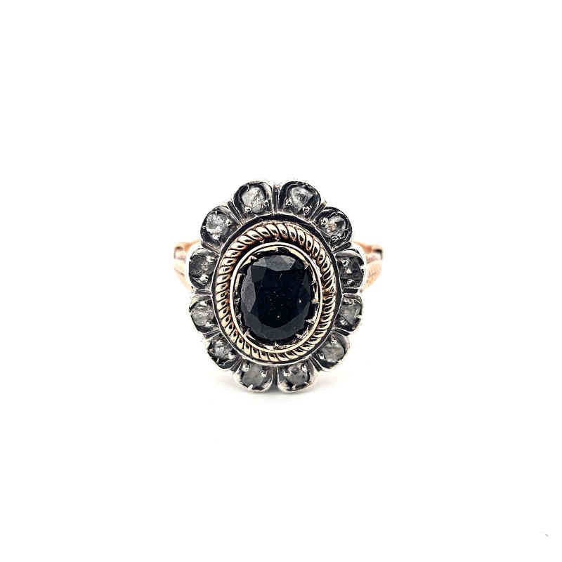 Изработен през 40-те години на XX век, пръстенът съчетава 18-каратово жълто злато и сребро, в която са вградени естествените диаманти със стариннашлифовка – характерен белег за ювелирното изкуство от онова време. В сърцевината му е вграден естествен сапфир с тегло 1.94 карата.